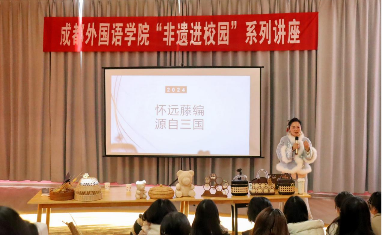 2024年11月25日下午,在百汇园南湖书院开展了由学校图书馆举办的“非遗进校园之怀远藤编”活动。此次活动有幸邀请到怀远藤编技艺第四代传承人、成都市级非遗传承人杨静老师作为主讲嘉宾,为我院师生们带来了一场关于传统工艺与现代生活融合的文化盛宴。