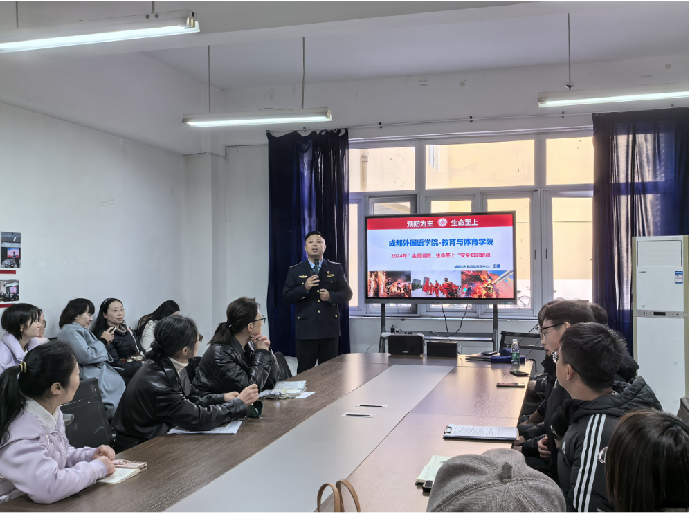 为进一步提升我院全体教师的消防安全意识和应急处置能力,11月26日下午在第一教学区A105会议室,我院特别邀请了成都市利民消防宣传中心的王健教官,为我院全体教师开展了一场以“全民消防、生命至上”为主题的安全知识培训。