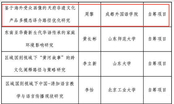 10月28日,经审定,(中国)中外语言文化比较学会区域文化研究专业委员会公布了2025年度研究规划课题立项名单。我院周黎老师申报的《基于海外受众画像的天府非遗文化产品多模态译介路径优化研究》(课题编号:CACS25ZC004)获2025年度研究规划课题正式立项。该课题聚焦海外受众画像,旨在优化天府非遗文化产品的多模态译介路径,以提升其海外传播精准度与文化影响力。