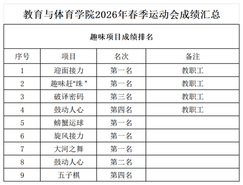 附:教育与体育学院2026年春季运动会趣味项目成绩汇总情况